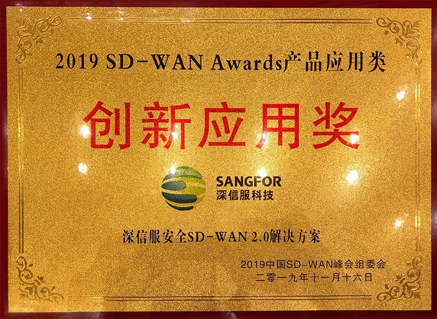 作为信通院SD-WAN技术白皮书撰写单位之一,深信服受邀出席峰会,并在峰会上向与会嘉宾分享了主题为《打造全场景连接的智能网络,开放生态助力产业发展》的精彩演讲。同时,凭借智能、安全、可视的方案创新能力,深信服安全SD-WAN 2.0解决方案荣获2019 SD-WAN Awards产品应用类“创新应用奖”。