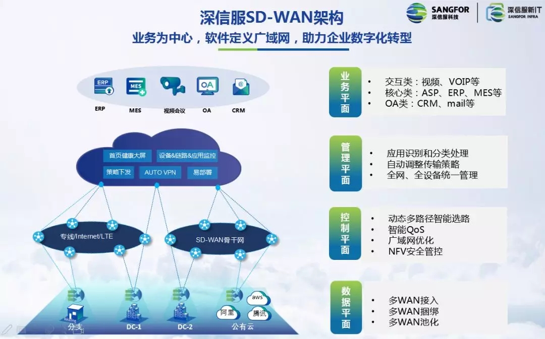 深信服软件定义广域网SD-WAN即具备智能、安全、可视三大核心能力,通过业务驱动网络设计,帮助用户构建安全合规、媲美专线访问体验、降低广域网建设和运维成本的全场景连接智能网络,满足企业对于组网的全新诉求,加速企业数字化转型。