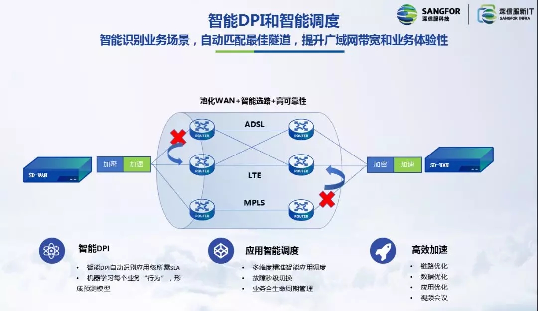 特别在智能层面,深信服SD-WAN通过智能内外网DPI、业务全生命周期智能调度、基于互联网加速模型,大幅提升多线路带宽利用率,全面提升业务访问体验。