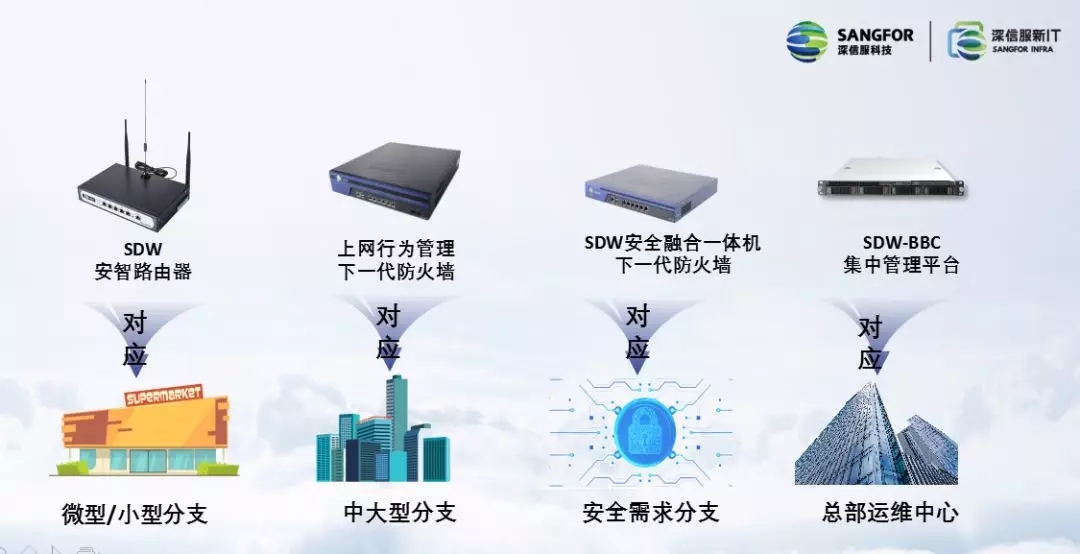 深信服组网系列产品不断推陈出新,致力于实现用户广域网全场景交付。目前,深信服SD-WAN产品系列包含SDW安智路由器、上网行为管理(内置SD-WAN模块)、下一代防火墙(内置SD-WAN模块)、SDW安全融合一体机等,满足不同用户专线选路和优化、多级分支安全互联、连锁分支组网、全球访问加速、云网融合等场景广域网建设需求。