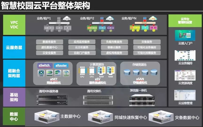 深信服通过极简、稳定、安全、高性能的超融合架构建设的智慧校园综合服务云平台,能够将校园各类数字化应用和多种数据结构整合到统一云平台中,实现资源的集中管理、按需分配、多系统数据的互通共享以及运维管理的高效便捷。此外,还能让个性化、异构的信息系统需求得以保证,满足校内各学院和全校师生不同层次和不同角色的IT服务需求。