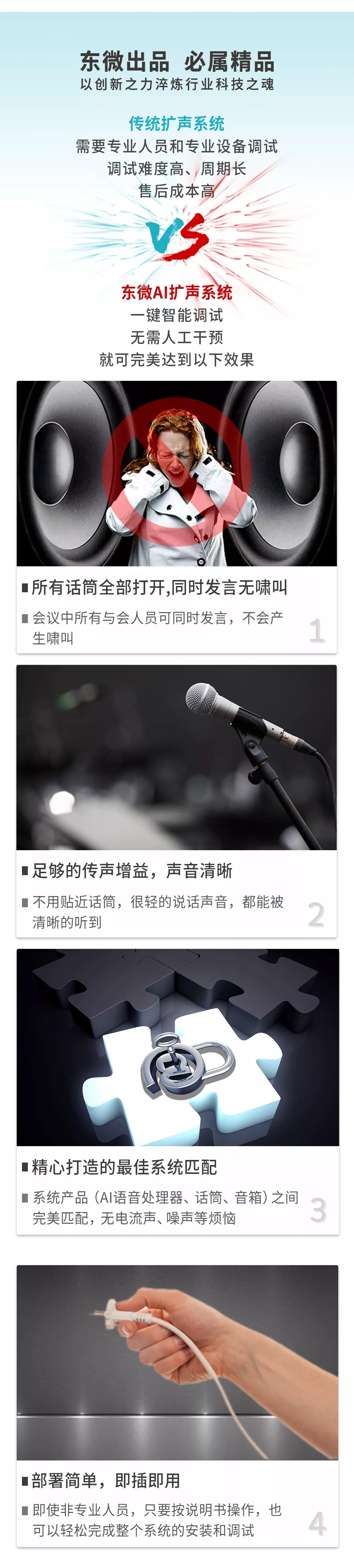 在这样的大环境下什么样的产品可以吸引用户的注意力?东微给出了一个全新的答案—会议室AI扩声系统。会议室AI扩声系统的应运而生,革新了传统会议室的使用模式,给用户带来了前所未有的极致体验。