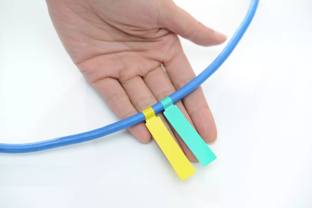 贴好标签头,将标签身与标签头连接,根据粘贴需求合上标签。在初始设置的时候明确规范,后续工作中也可通过标识的形状分辨线缆作用,更容易系统管理。
