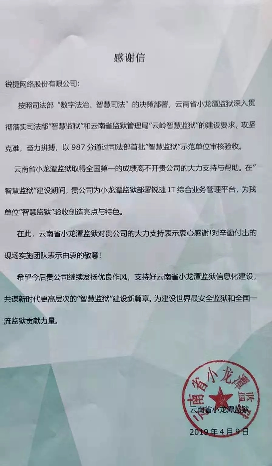 ▲ MOUU网络荣获云南省小龙潭监狱感谢信