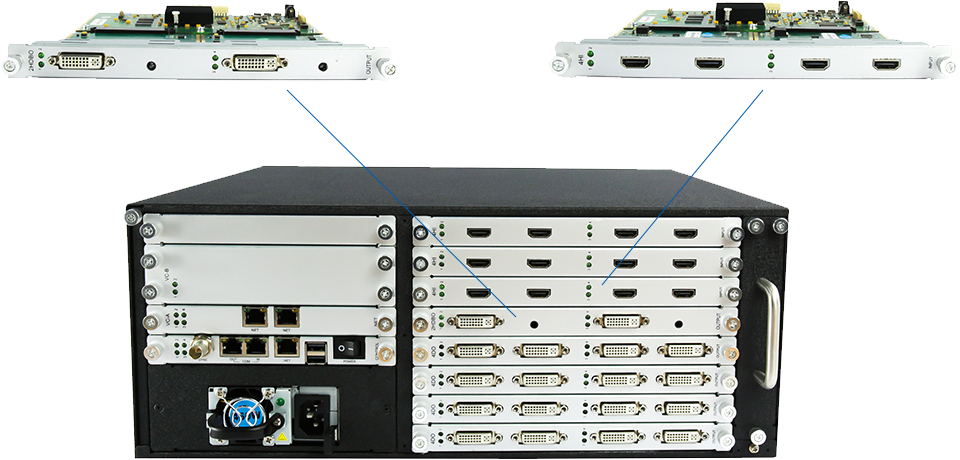 为工程人员提供了便利,同时部分机箱配置了输入板卡为子母卡架构,母卡对接多张子卡,每张子卡多个接口,可以任意两种接口组成1张板卡,