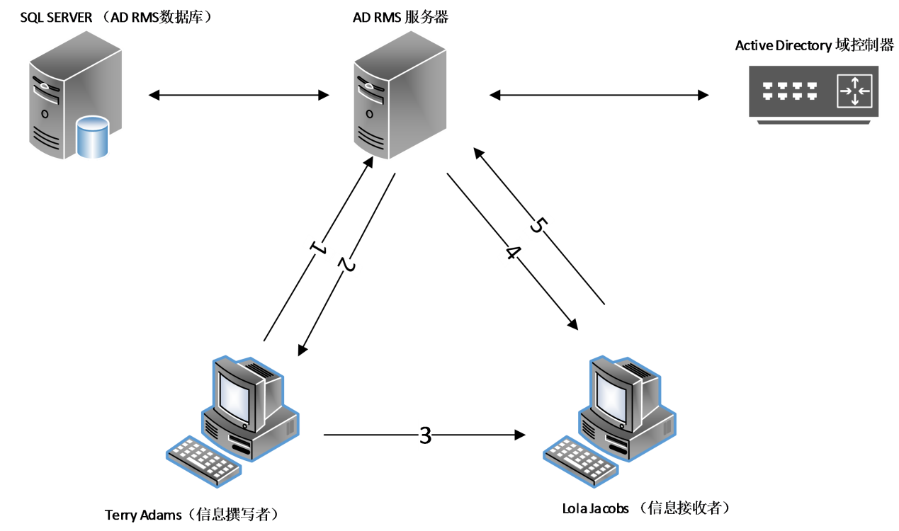 1、Terry 新建了一个文档并设置Lola对文件仅查看的虹膜权限,然后计算机的RMS 客户端以他的AD账户RMS 服务器发布并启用了服务请求;