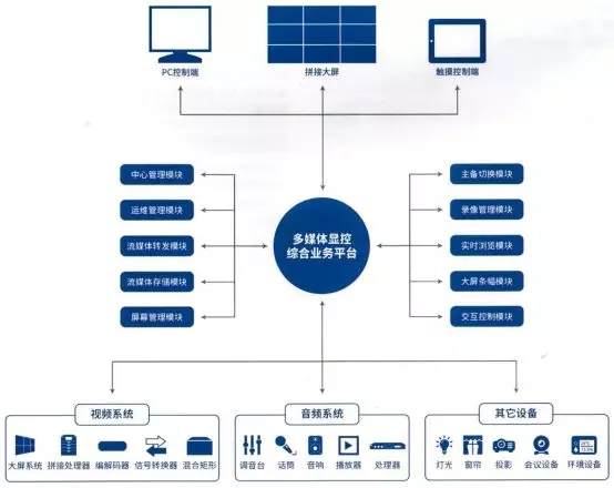 平台可同时管控视频、音频、环境、安防、会议、存储录播等系统,并对其状态进行实时反馈,控制交互界面可根据用户实际使用情况自定义配置,一套软件即实现了全媒体管理。