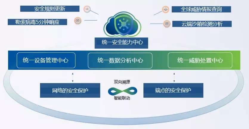 以勒索病毒为例,勒索病毒极度灵活,入侵方式及途径较多,解决勒索病毒是一项体系化的工程,既要考虑网络和业务终端入口的封堵,同时要考量勒索在进行密集外联时如何在网络侧进行有效识别,并在业务终端迅速进行勒索病毒的回溯,在勒索病毒大范围横向逃窜时,也可以迅速断切段东西向的横向攻击,而这一切需要的是安全设备间的整体协同联动能力。