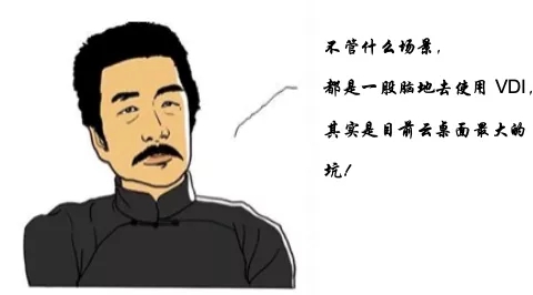 一提到云桌面,大家往往想到的就是VDI(Virtual Desktop Infrastructure,虚拟桌面基础架构方案)。的确,这几年VDI的市场培育工作干得不错,让很多人错觉云桌面就是VDI。很多时候,一听到客户有云桌面的需求,就立刻一股脑地撸VDI,而客户那边呢?很多时候是云桌面的初体验,结果,体验不佳,这辈子都不想再用云桌面了。