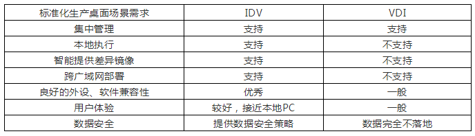 相信大家对基于VDI架构的云桌面方案大概有所理解了,结合我们标准化生产桌面场景来看,无法避免跨广域网部署以及外设、软件兼容性较差这两个问题,就导致了VDI这种架构就在这种场景中不太合适。细节先不说,乘热打铁,对比VDI,下面我们再来看一下基于IDV架构的云桌面,它究竟又能给我们带来哪些惊喜呢?又能否满足标准化生产桌面场景的需求呢?