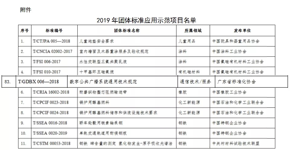 经社会团体自愿申报、地方或行业推荐、专家审查和社会公示等环节,遴选出103项2019年团体标准应用示范项目,其中,itc主编《数字公共广播系统通用技术规范》通过遴选从众多申报团体中脱颖而出,顺利入围2019年团体标准应用示范项目名单。