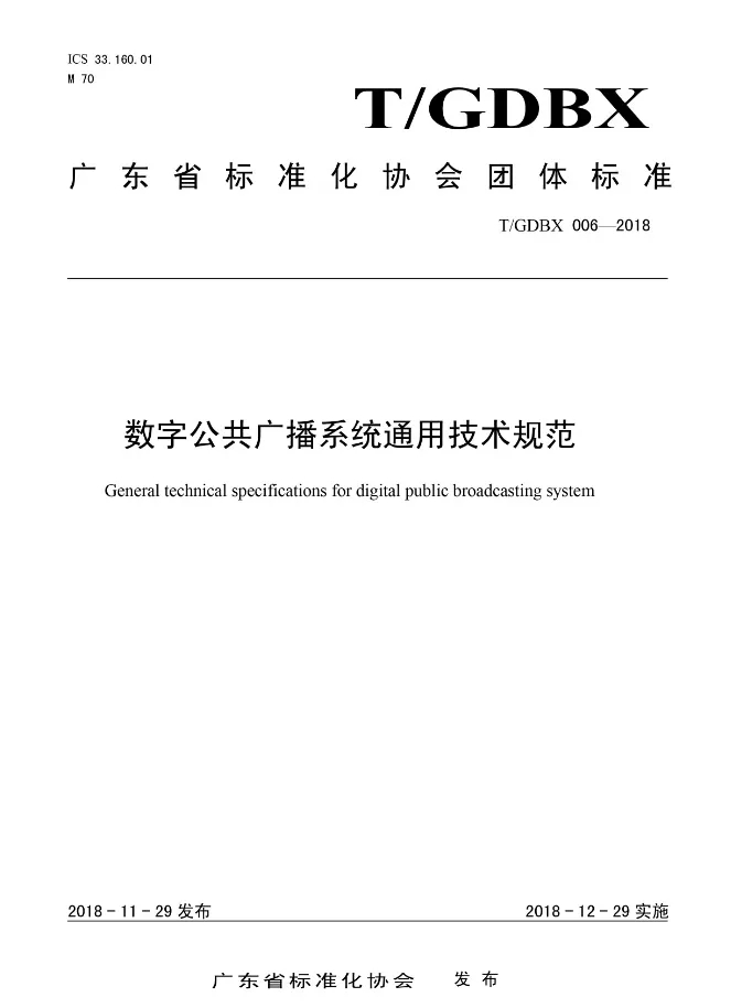 2018年12月itc主编的《数字公共广播系统通用技术规范》率先通过了广东省标准行业协会的专家评审,并于2018年12月29日实施。