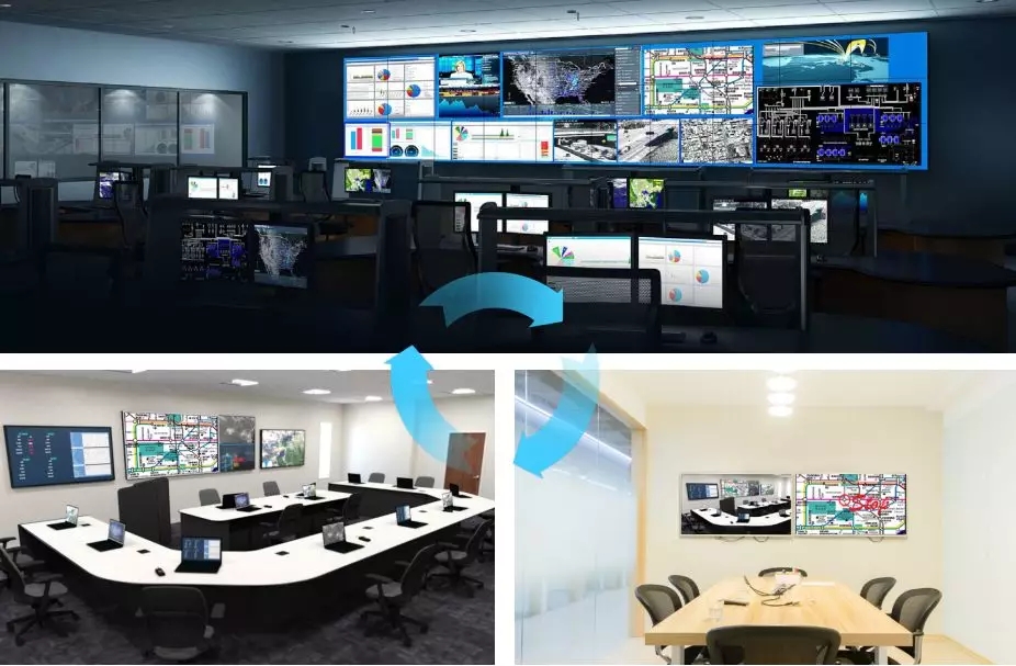 1、灵活会议,协同指挥:会议形式不受场地、时间、人员限制,多会议室信号实时共享,提高会议效率。