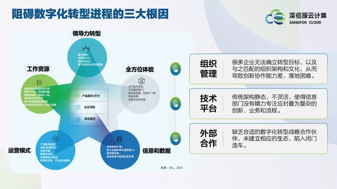 会上,深信服云计算CTO曹心驰进行了《融合创新打造数字化转型基石》的主题分享。当前,在各行业积极推进数字化转型的大环境下,各产业和组织架构凸显出来的信息化建设问题越来越具体,然而以往头痛医头、脚痛医脚的建设思路让数据中心逐渐形成尾大不掉之势,大多数企业的数字化转型并没有取得预期成效。如果从领导力转型、全方位体验、信息和数据、运营模式、工作资源五大维度去梳理,不难发现决定企业数字化转型成败的三个根本原因。