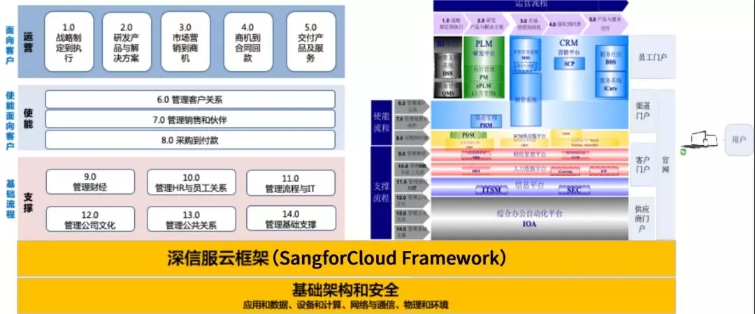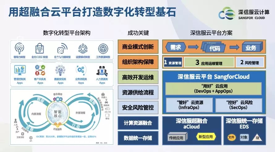 数字化转型是一个宏大的系统性工程,涉及组织、生态、平台等方方面面的问题,深信服云计算聚焦于用户的数字化业务场景,在深入了解数字化场景发展路线的基础上,以超融合为核心打造云平台,形成“1种基础架构,4大应用场景;全栈云平台,全生命周期云服务”的云化路径,将数字应用与基础架构融合设计,打造敏捷开发、高效运维、风险可视的一体化数字化转型平台。