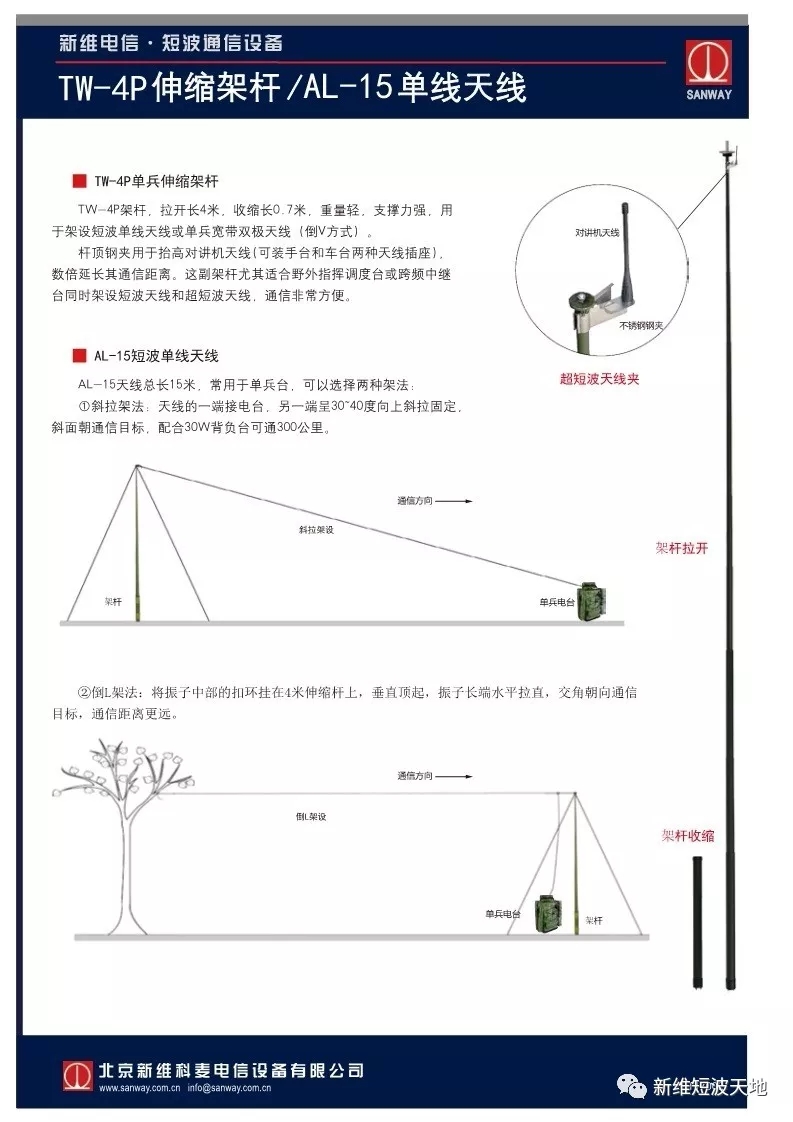 倒V架设:中央用6米杆顶起,两端斜向拉直,全方向通信。