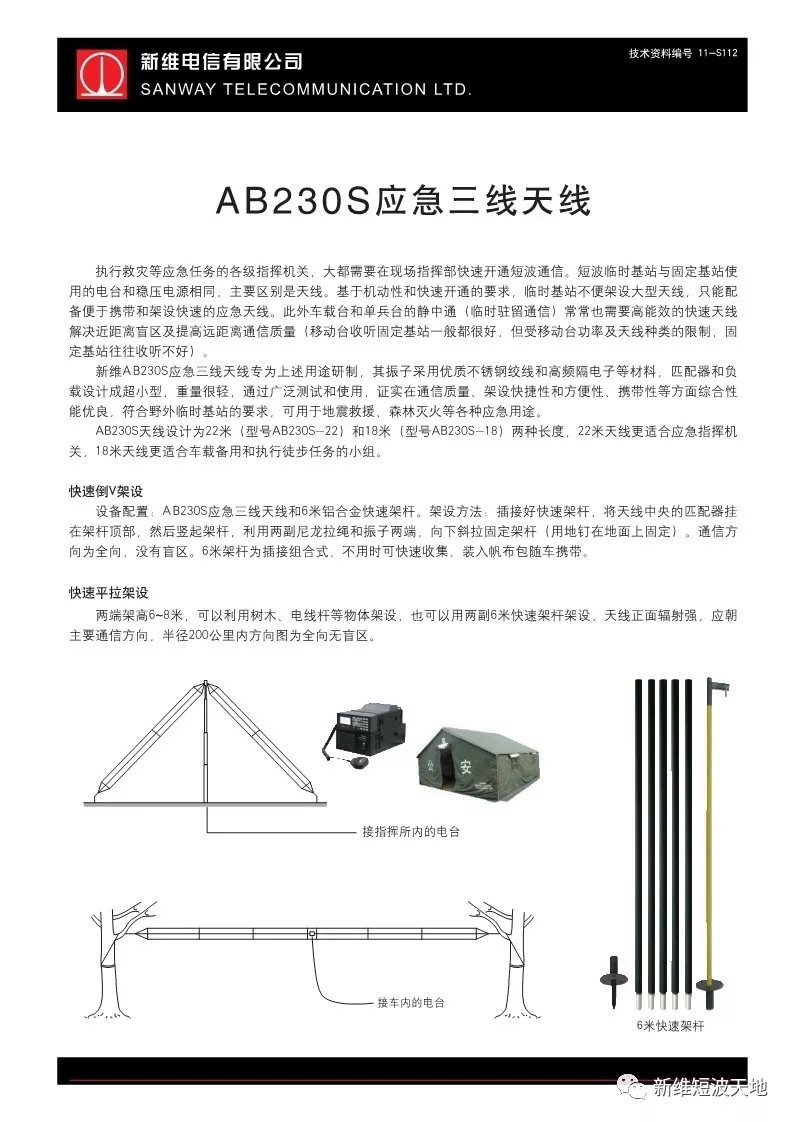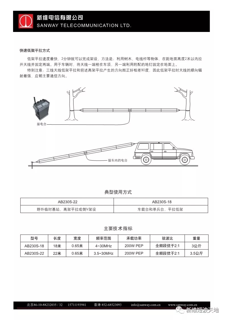该天线全频段低驻波比,可选用平拉架设(2000公里以上定向通信)或倒V架设(0—800公里全向无盲区),配合125W电台通信性能优良,是应急指挥所的优选天线。