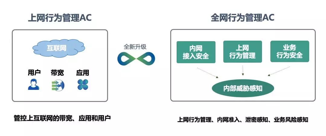深信服关注到用户在新形势下所面临的内部威胁挑战逐渐升级,上网行为管理AC在原有管控互联网的基础上,基于多年的技术积累将能力延伸到管控全网的用户、终端、业务和数据,升级为全网行为管理AC,给用户带来更高的价值。