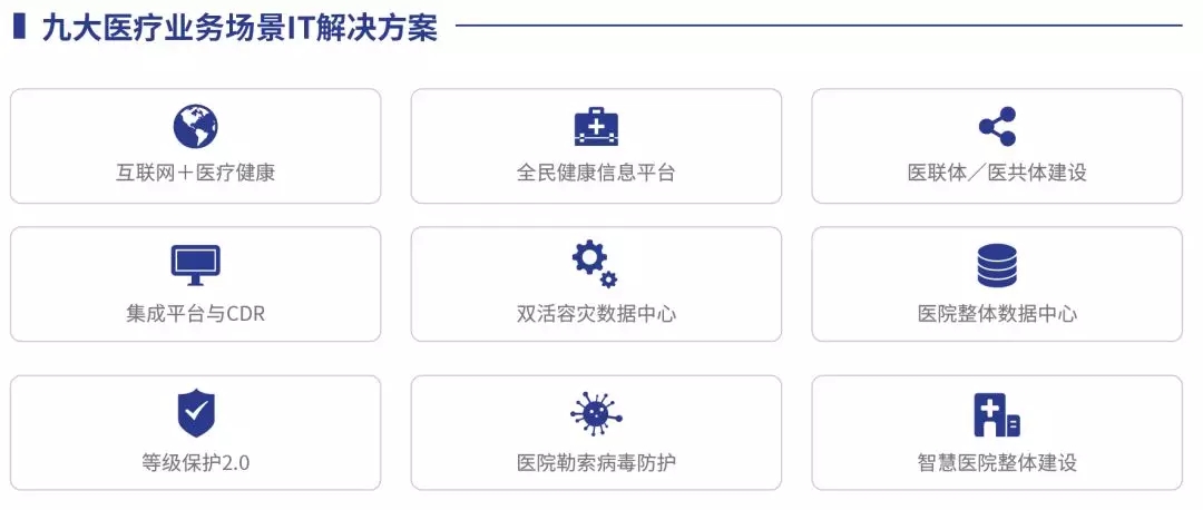 “互联网+医疗健康”建设方案、全民健康信息平台建设方案、医联体/医共体建设方案、集成平台与CDR场景建设方案、双活容灾数据中心建设方案、医院整体数据中心建设方案、等级保护2.0建设方案、医院勒索病毒防护方案、智慧医院整体建设方案。