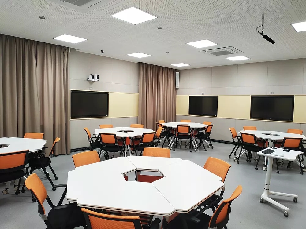录播系统和智慧班牌让教学质量得到保障;调度屏可以通过控制界面将教师屏幕或某个小组屏幕投影到其他小组屏,使教学内容或小组展示更加直观,信息流转速率大大提升;四面书写墙使室内墙壁可书写和擦除,既增加书写面积又为交互研讨提供更多便利;
