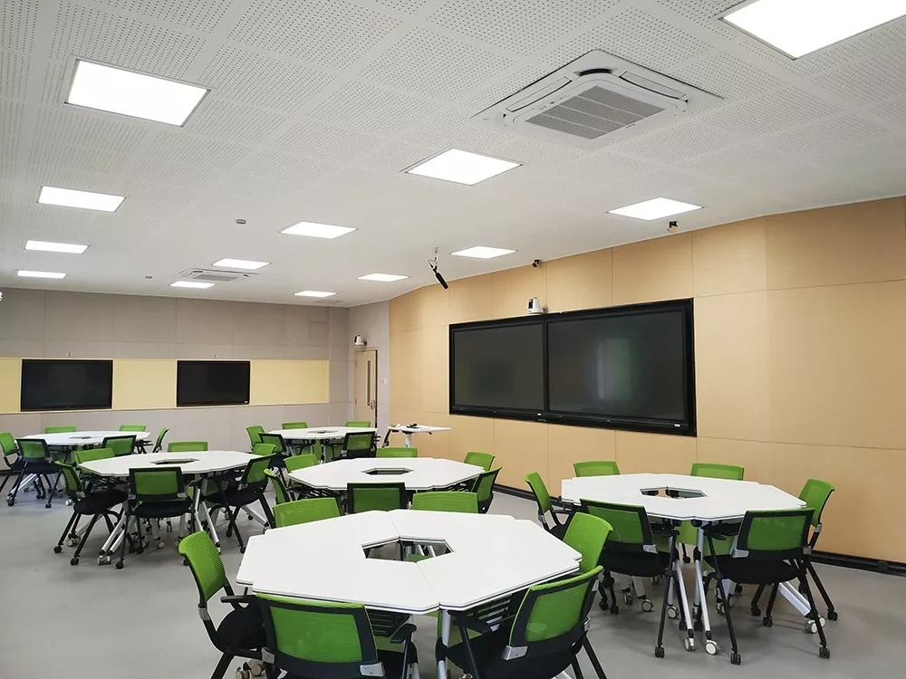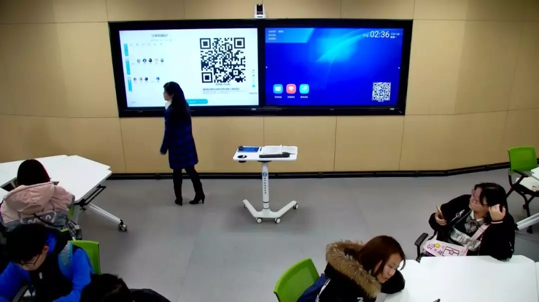 明亮的采光,绿色和浅棕色为整个智慧教学试验区定下了清新怡人的基调;每间教室的门口安装有电子显示屏,便于查看课表及室内授课情况;教室里,一改过去单一的直排桌椅排列方式,桌椅可根据需要围成各种形状,便于学生分组交流讨论,互动性更强……西区教学楼A栋和B栋6楼经过50天彻头彻尾的建设,呈现给我们充满现代科技气息的“智慧教室”。