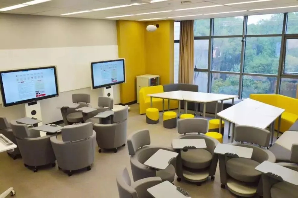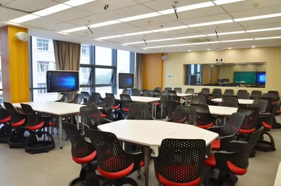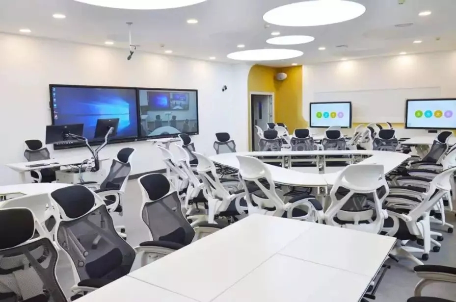 学校在教室吊顶上安装了4K超高清探头和全方位拾音麦克,让清晰的声音传遍每个角落,同时,教室内的座椅可以采用多种组合形式,利用四台移动式触摸一体机,结合学生端PAD联动大屏操作。