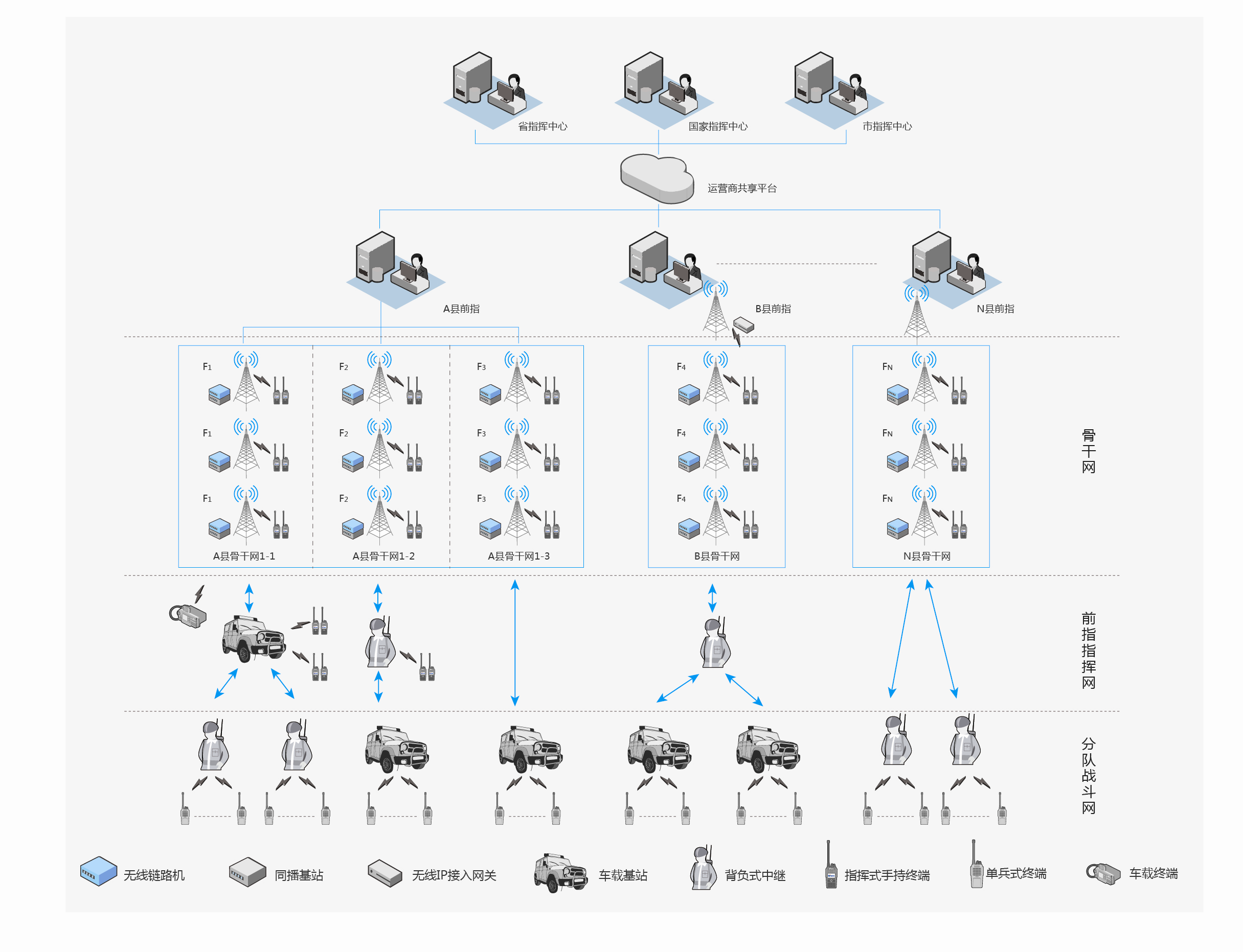 整体设计思路是采用骨干网、前指网、分队战斗网三层组网结构,融合超短波通信、北斗卫星通信、卫星通信等多种通信方式的各自优势,完美运用现代数字通信技术,全面结合应急通信保障场景及贴近实战要求,为用户提供便捷高效、稳定可靠的无线应急通信保障。