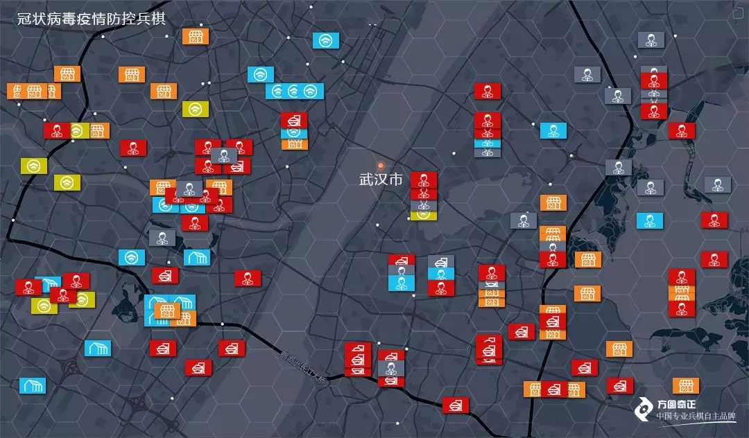 针对疫情防控的诸多问题,基于公司国家应急救援兵棋推演平台,方圆奇正设计了一款《冠状病毒疫情防控兵棋》,主要采用兵棋推演技术、医学病理、传染学等理论知识,结合疫情病毒的预防、发现、识别、隔离、控制、人员防治救护等基本业务,推演疫情传播蔓延和防控救治过程,研究疫情防控的战略决策、指挥调度、物资供应、交通运输、环境防疫的具体方法手段。