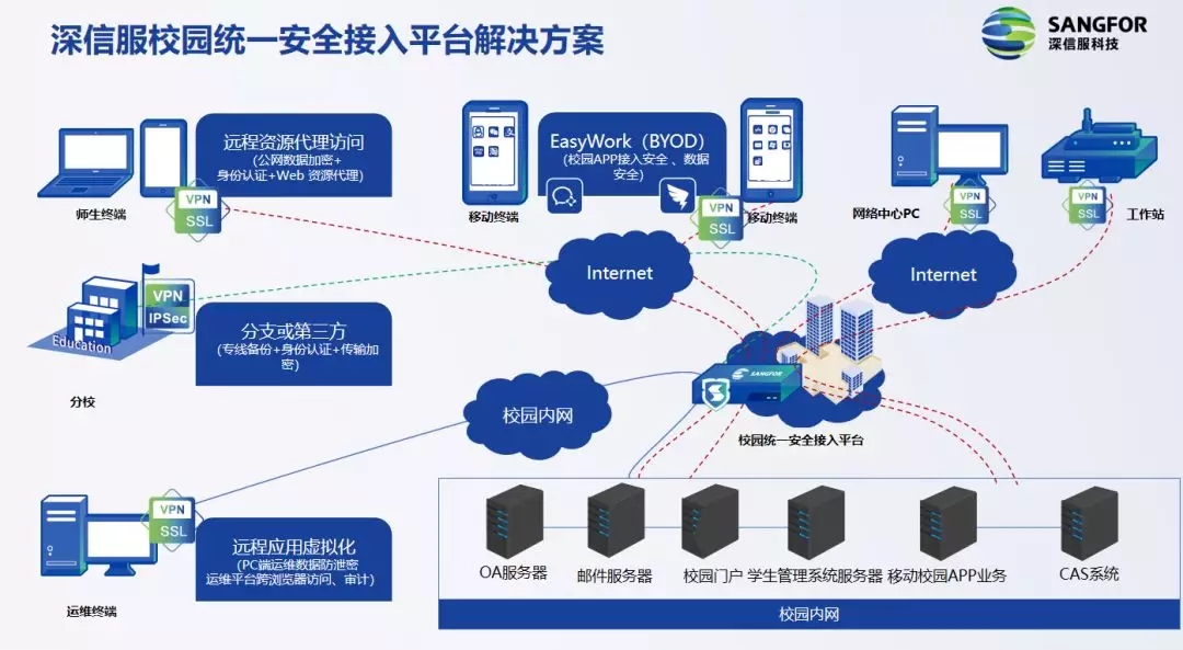 疫情期间,大多数学校师生选择远程办公,但是远程办公终端安全水平参差不齐、终端硬件配置及系统版本不一,办公应用如选课系统、科研计算系统、财务系统无法安全有效使用。深信服推出远程办公桌面云方案,保障教育办公应用安全、稳定、高效地运行。