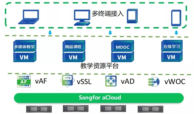 用户可将业务承载在深信服超融合aCloud上,通过“服务器+aCloud”快速构建教学云平台,以应对疫情期间高并发访问需求,实现按需弹性扩容。