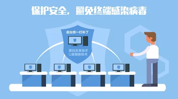 可以通过后台统一为所有终端打补丁,避免了终端感染病毒。另外,还可以通过黑白名单技术、U盘阻断技术等确保系统安全性。