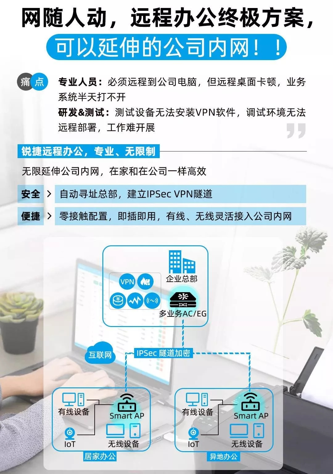 疫情背景下,各大公司都远程开工,各种云平台、VPN软件可以解决大部分人远程办公的需求,但,有部分人群,目前的远程方案无法满足工作需求。即需要连接公司内网进行调试或测试的专业人员,以及业务系统在公司内网但远程桌面卡顿的人员。针对这两类人群远的程办公需求,MOUU无线专门推出远程办公终极方案,无限延伸公司内网,让在家和在公司办公一样高效。