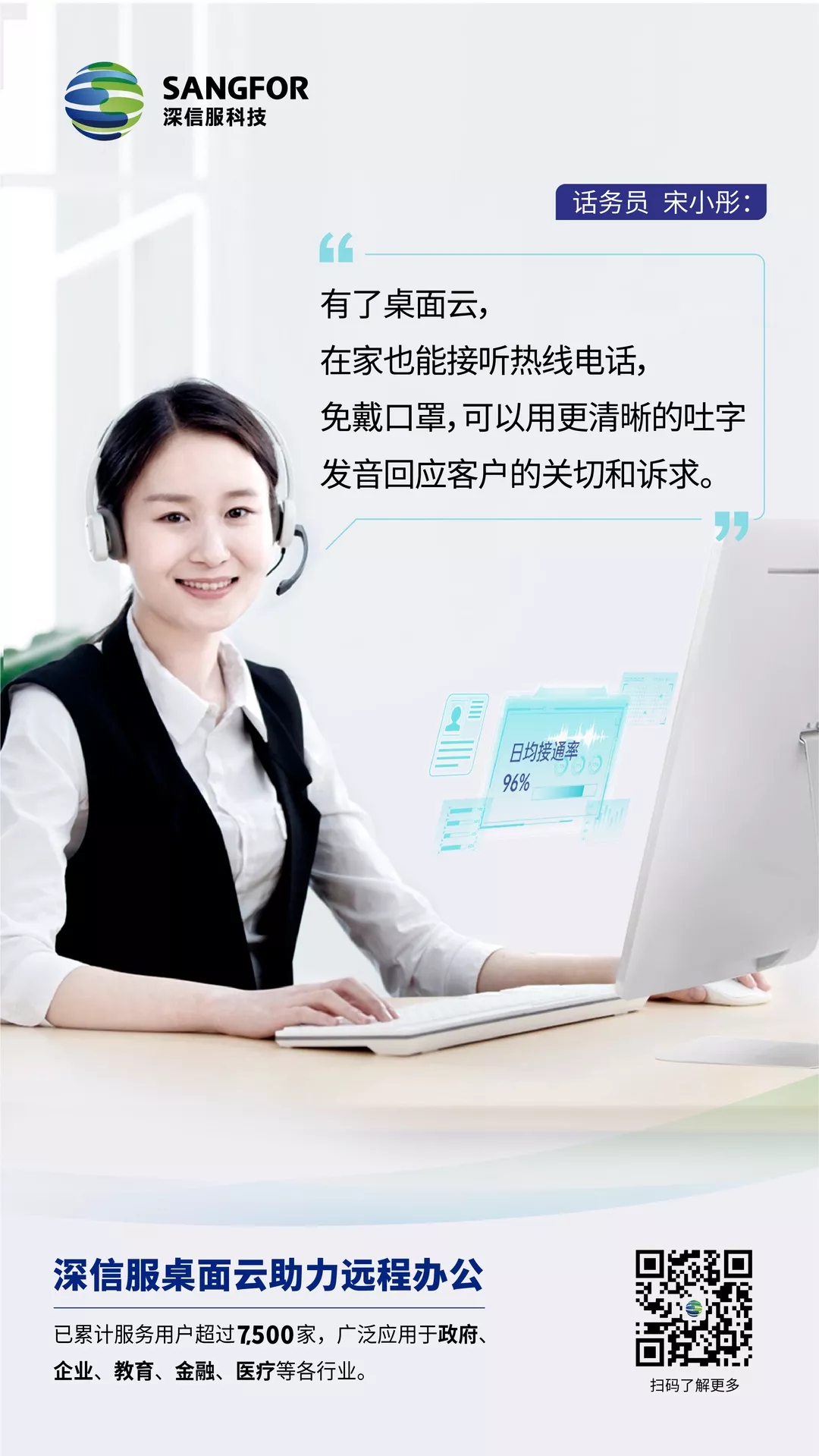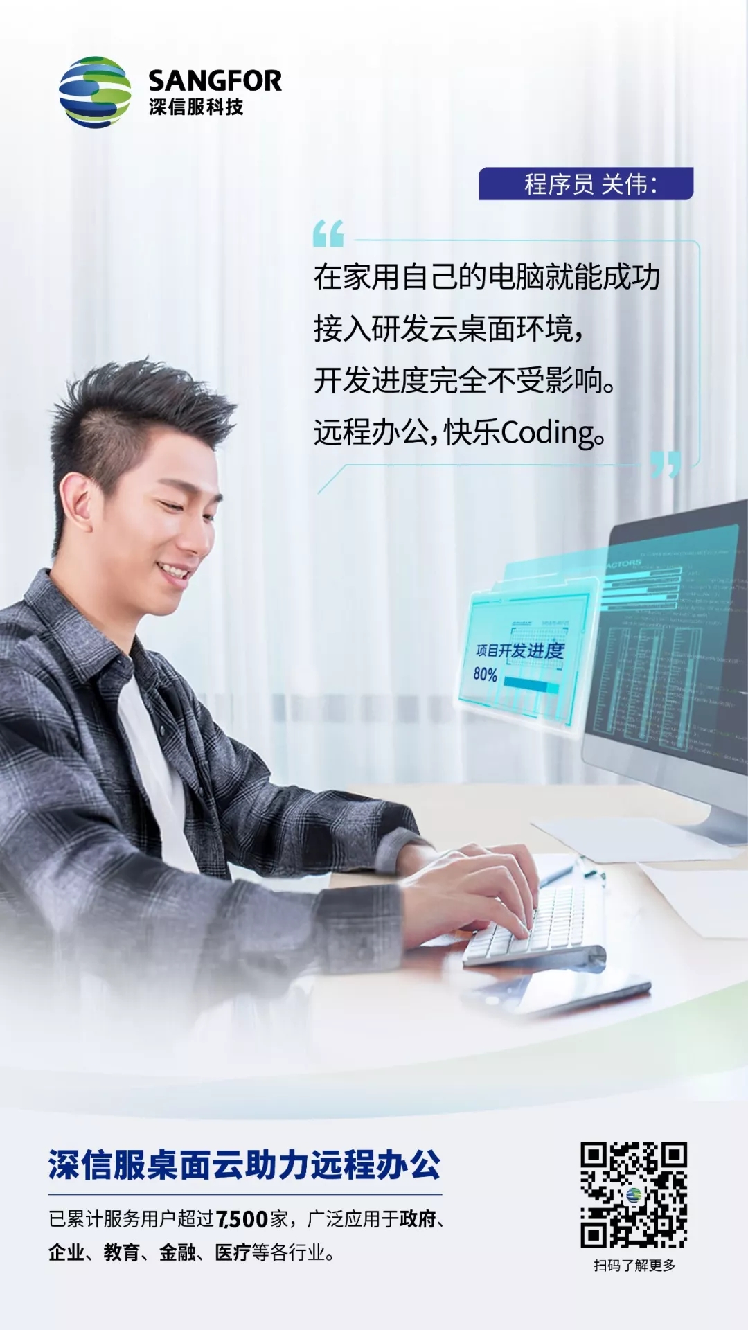 深信服桌面云已累计服务用户超过7,500家,在疫情期间,帮助政府、企业、教育、金融、医疗等各个行业用户,应对不同场景的远程办公需求,真正做到隔离疫情,不隔离生产力。