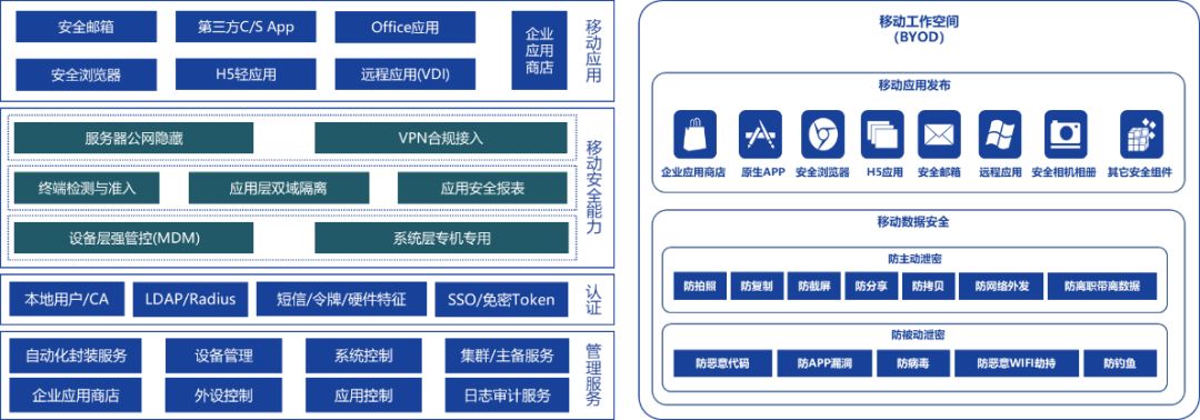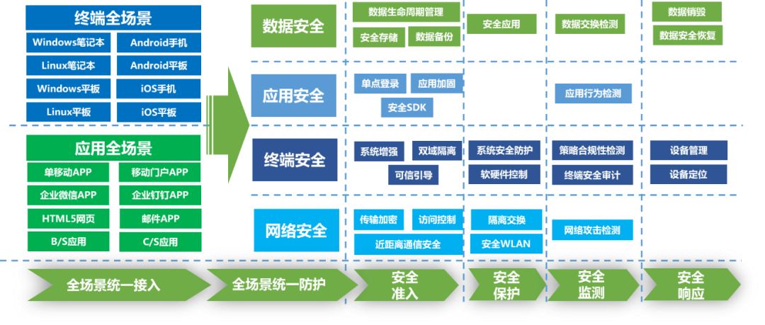 在移动应用、移动安全能力、移动安全认证、移动安全管理服务四方面,进行应用安全基线建设,统一应用安全基线;通过移动沙箱保障移动端数据安全,通过桌面云、PC沙箱、远程应用发布保障PC端数据安全,统一数据安全基线。