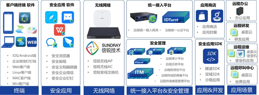 提供从终端、安全应用、无线网络、统一接入平台&安全管理到应用&开发层面,全面的远程办公方案。支持各类客户端软件、安全应用软件,提供无线网络、统一接入平台、安全管理、应用商店、安全应用SDK。满足金融行业远程办公和移动办公、远程研发、远程运维、远程呼叫中心全场景的安全和使用要求。