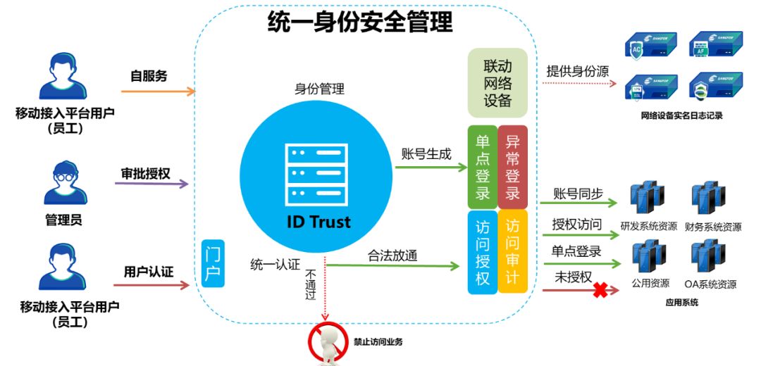 通过全场景统一认证平台,从统一门户、统一认证、单点登录、自助门户、权限管理、行为审计六方面,实现远程办公接入平台用户的统一身份安全管理。