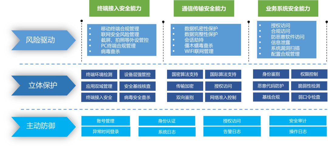 从风险驱动出发,启用端到端的立体防护、主动防御能力,在终端接入安全、通信传输安全、业务系统安全三方面进行统一保护。