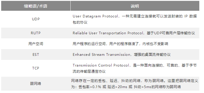 对于RUTP协议目前只支持“丢包率<=1%,延时<=50ms,抖动<=10ms”的场景。当用户网络在“丢包率为1%,延时为50ms左右,抖动为10ms”时,桌面基本可用,但流畅度上较“丢包率为0.5%,延时为30ms”时会差一些。因此需要明确客户所使用的具体业务对桌面要求进行评估。