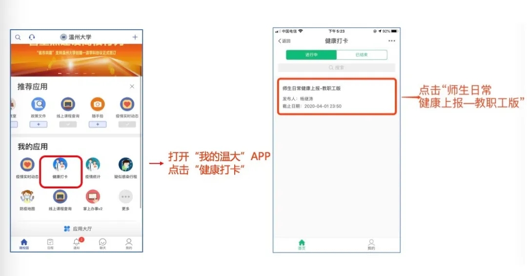 1.根据每日报送要求,MOUU将“健康打卡”整合到“我的温大”APP 中,避免了师生在手机终端再次安装程序,多应用、多账户、多入口的烦恼,争取上线时间。