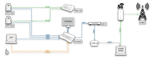 最后将经由洋铭SE-500HD现场制作好的切换信号输入到一台洋铭的U盘录像机HDR-1当中,进行企业培训课程的本地录制,再将信号继续输送到洋铭的HDMI信号采集盒CAP-2当中,进行信号采集进会议互动软件或者广播直播软件,最后利用华为的5G路由器通过5G网络进行网络播出。