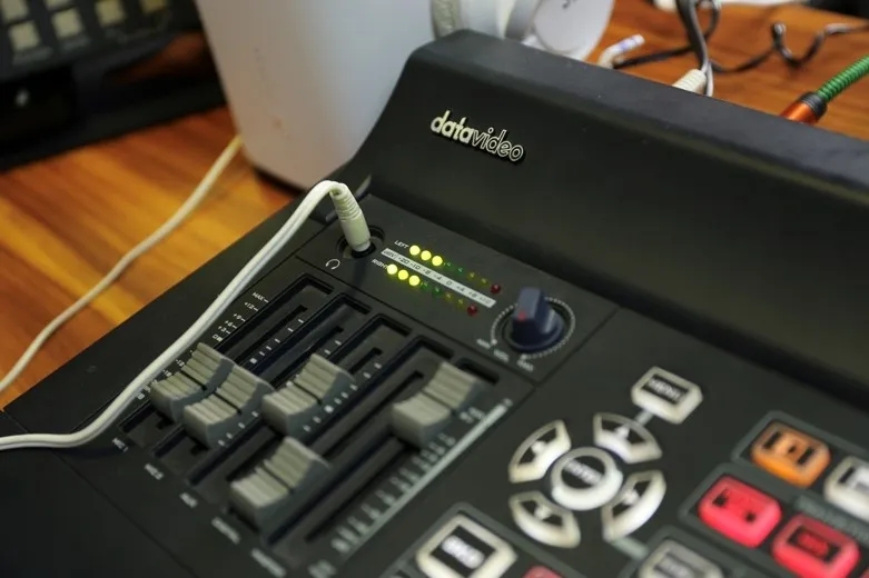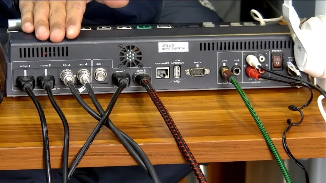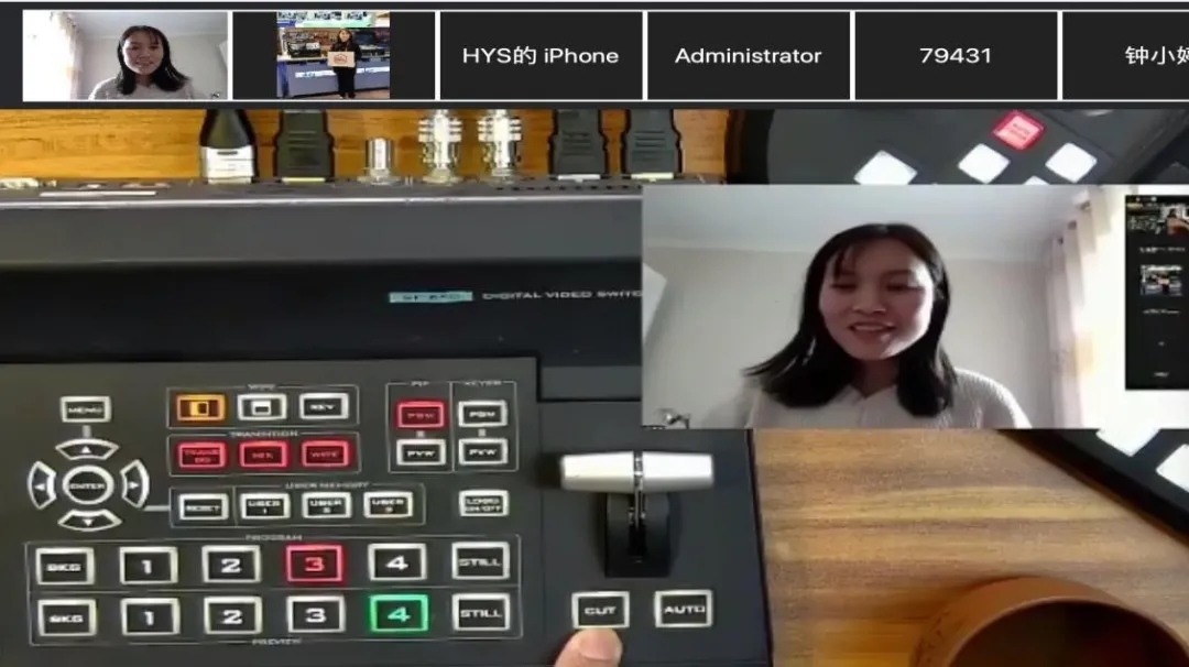 2台云台摄像机和讲义内容PPT信号全部进入洋铭的SE-500HD高清导播台,同时也将企业讲师的麦克风接入到洋铭的SE-500HD,SE-500HD可以同时对音视频进行现场导播切换,而且这台高清切换台还可以做竖屏直播,一台多用。