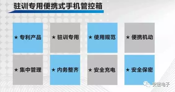便携式手机管理箱是针对部队野外驻训时解决单位人员手机集中存放管理、涉密场所屏蔽手机信号以及手机无损充电等问题而研发。该设备由便携式高强度带密码手提箱、手机充电支架、充电控制器、稳态电源、散热通风系统组成;便携式手机管理箱适用于部队、政府机关、企事业等各类涉密场所,该设备箱能够对人员手机进行集中安全管控,防范手机失泄密问题的发生。