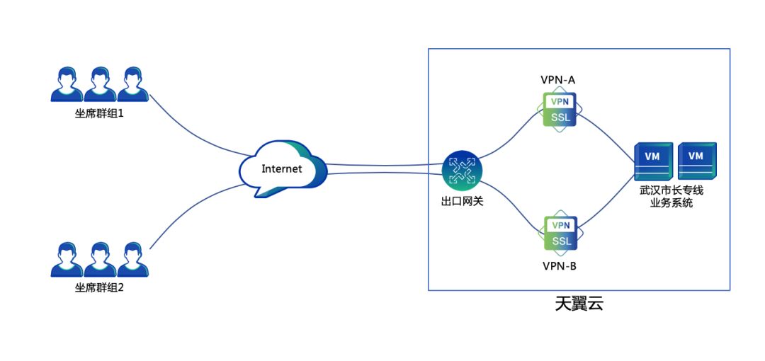 深信服通过天翼云平台向“武汉市长专线”提供了两套vSSL VPN服务授权。为确保平台稳定可靠运行,将坐席人员的账号分为两个群组,正常情况下,两组坐席人员分别通过两套vSSL VPN登录“武汉市长专线”平台。假如其中一套vSSL VPN出现故障,可由另一台正常工作的vSSL VPN同时为两个群组提供服务。