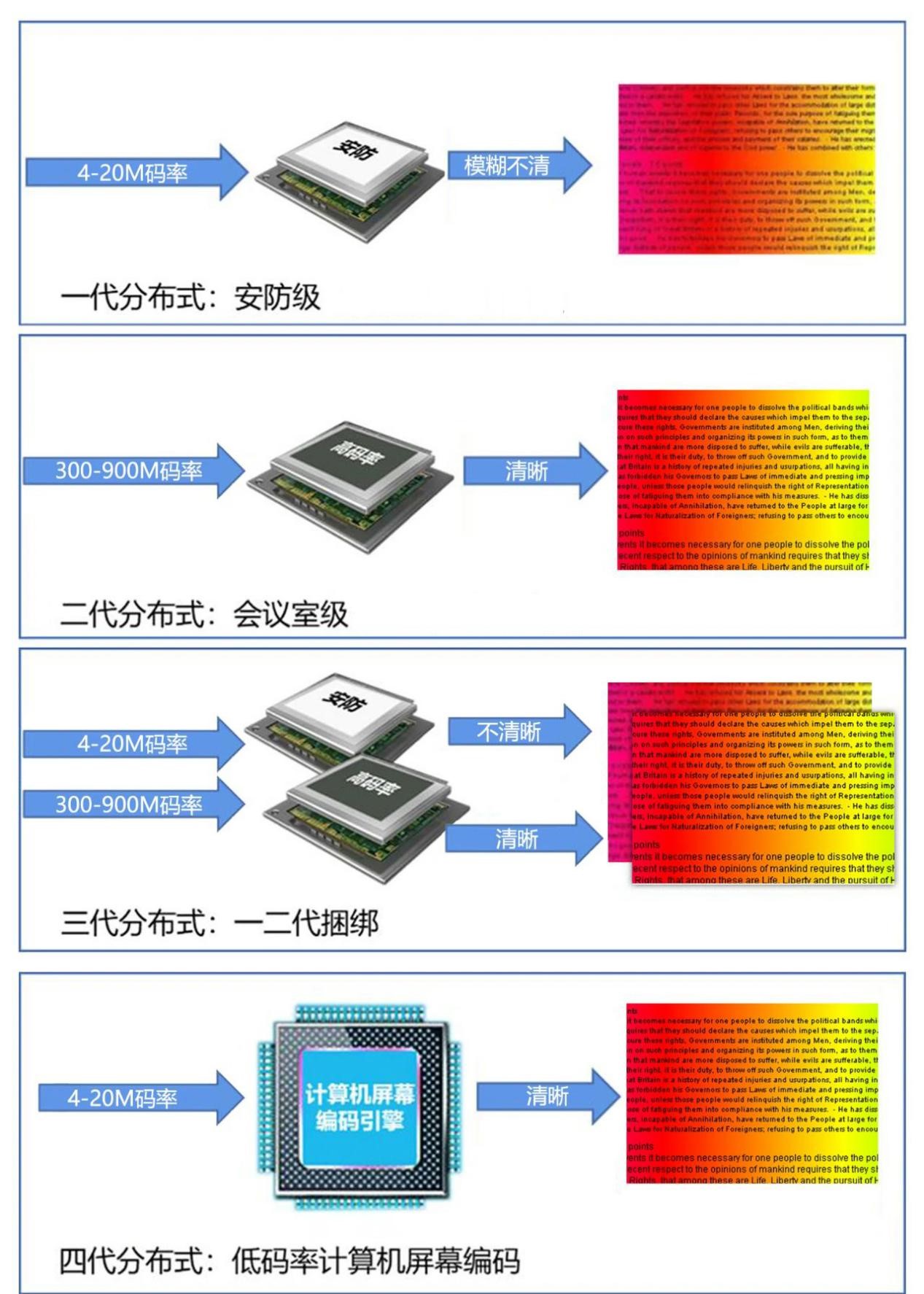 第四代分布式技术的核“芯”处理能力强大,可以一颗“芯”解决低带宽(20M以内)和极高画质(如《七大标准判别分布式系统的优劣(上)》中提到的画质问题),从而系统极为简约,对系统功能表现和系统稳定性起着至关重要的作用。