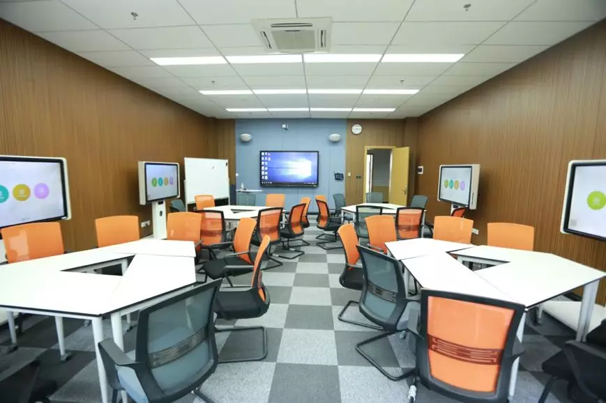 在超过200米的大型教室,MOUU采用了极简互动学习空间的设计,基于原有的会议室稍作改造,采用横板的教室局部,在教室两侧加入扩展屏幕实现主屏幕的视野延申,让坐在两侧和后面的学生可以轻松看到老师的教学课件。扩音系统也让整间老师的声音自然放大,形成环绕立体声效果。后期该教室还可以很方便地向研讨型教室过度。