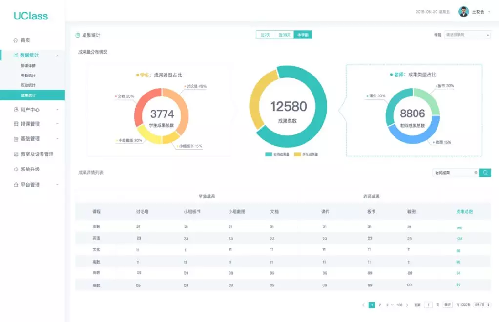3.通过数据分析改善课堂效果:提供教室使用情况统计、学生考勤统计、课堂互动统计、师生成果统计等,帮助管理者了解应用开展落地情况以及效果,促进应用落地。多维度数据采集,助力教学与管理建设。