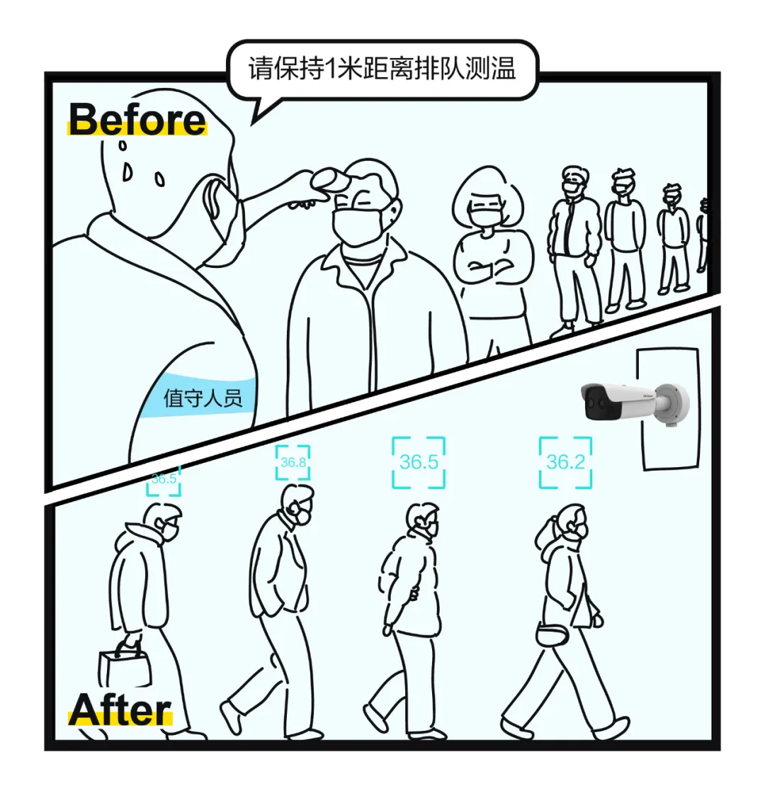 人们可以快速地边行走边接受非接触测温,值守人员也在一米之外的安全距离查看。人们出行不用因测温排起长队,值守人员也更安全啦