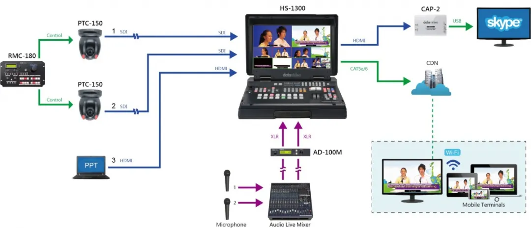 Datavideo HS-1300 HD 6通道便携式多机位移动及虚拟演播室:是Datavideo 最受欢迎且实用的便携式演播室,整合视频切换、录制、直播和屏幕监看功能于一体。可藉由子母画面功能(PIP) 同时显示两组画面,并可将影像画面投放到大屏幕或通过IP网络传输,这些功能对于制作视频会议影片非常实用。
