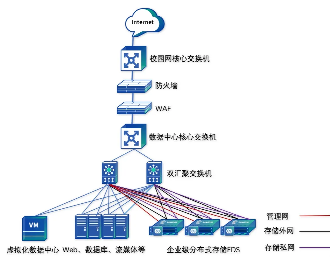 原有的存储已无法满足学校疫情期间开展网络教学的需要,山东理工大学果断采用新方案,即通过部署高性能、灵活扩展、稳定可靠的深信服企业级分布式存储系统EDS单独承载新网络教学综合平台,快速解决了疫情期间存储燃眉之急。