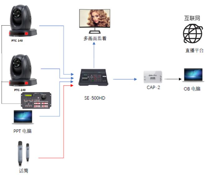 接着,让小编手把手带你学习如何进行该直播的连接和操作步骤吧:利用三台ptc-140摄像机,信号通过HDMI线连接到SE-500HD,PGM主输出信号输出到CAP-2外置采集盒,电脑主机识别到datavideo洋铭的cap-2为外来USB摄像头信号采集进行电脑平台的直播(例如钉钉、企业微信等等在线直播),同样也适用于抖音的外置输入直播。